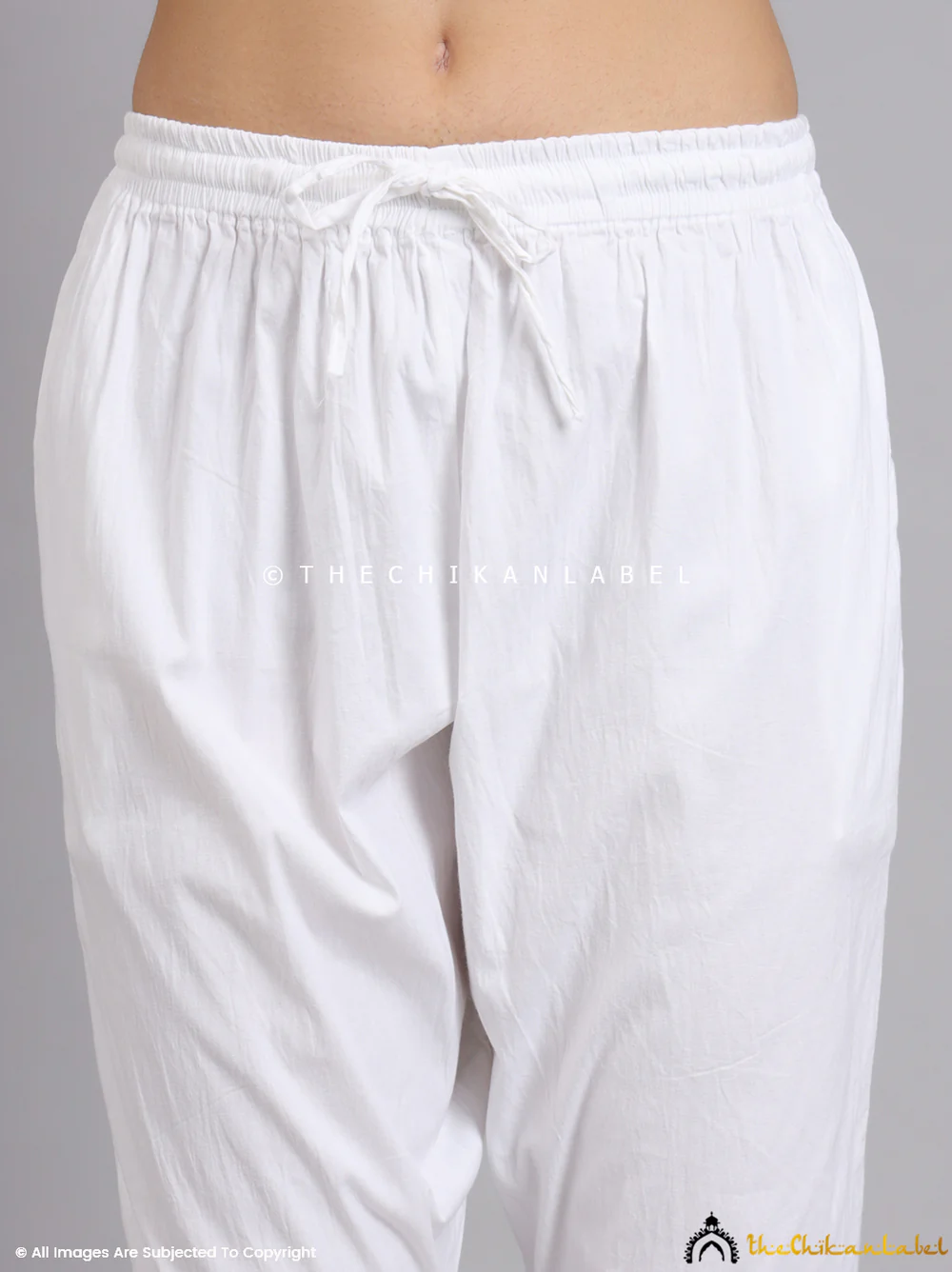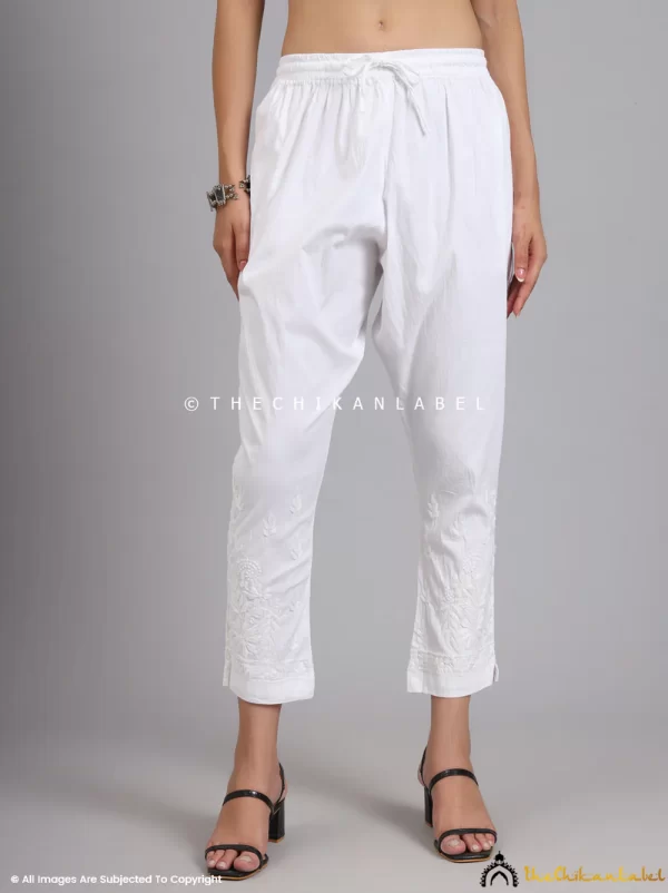 TheChikanLabel designer studio presents White Umika Lycra Straight Chikankari Cigarette Pant. Floral motifs with intricate embroidery delicately placed on handmade chikankari piece. This perky hand embroidered Lucknowi chikankari masterpiece is a reminiscent of blooming springs and the serenity that surrounds it. Your skin will surely fall in love with soft fabric. This will keep you comfortable all day long and make yourself happier.