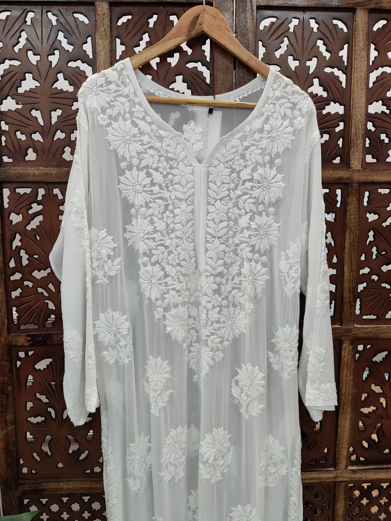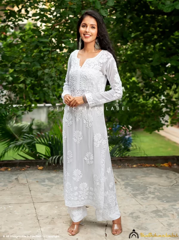 The ChikanLabel designer studio presents the White Viscose Chikankari Straight Kurti. Floral motifs with intricate embroidery are delicately placed on handmade chikankari kurtis. This Lucknowi chikankari kurti is reminiscent of blooming springs and the serenity that surrounds it. Your skin will surely fall in love with this soft fabric. This will keep you comfortable all day long and make yourself happier.
